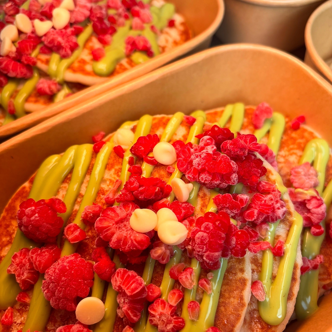 Description: Fluffy American style pancakes drizzled with creamy pistachio sauce. Topped with crushed frozen raspberries & white chocolate chips.